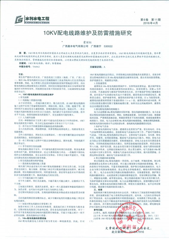 10KV配电线路维护及防雷措施研究