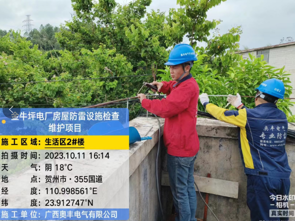 由我公司中标实施的广西桂冠电力股份有限公司昭平分公司金牛坪电厂房屋防雷设施检查维护项目2023年10月10日正式进场施工。详见下图: