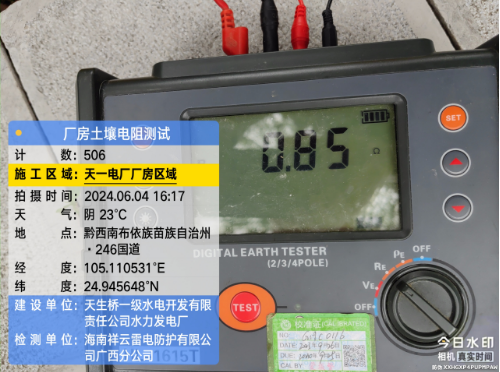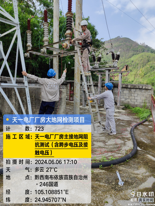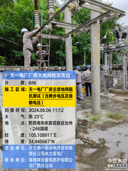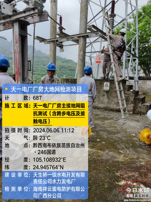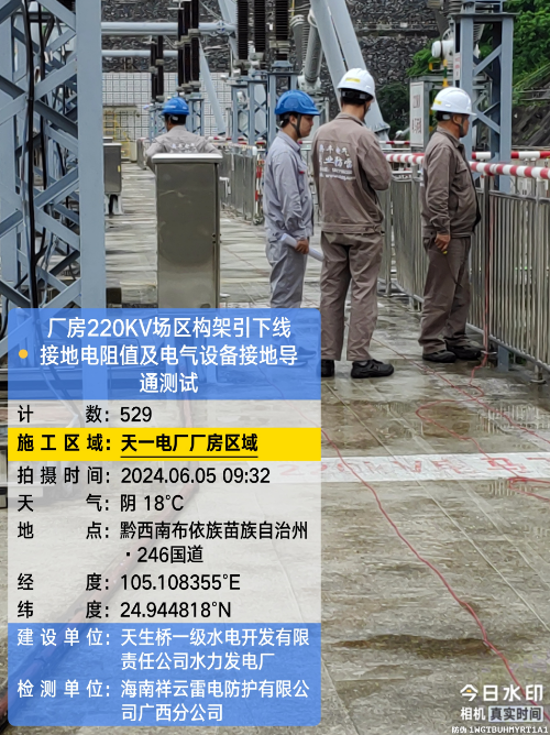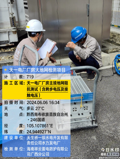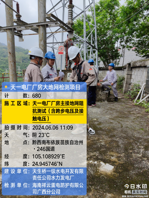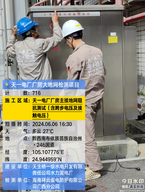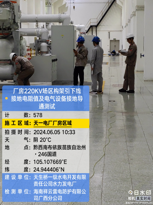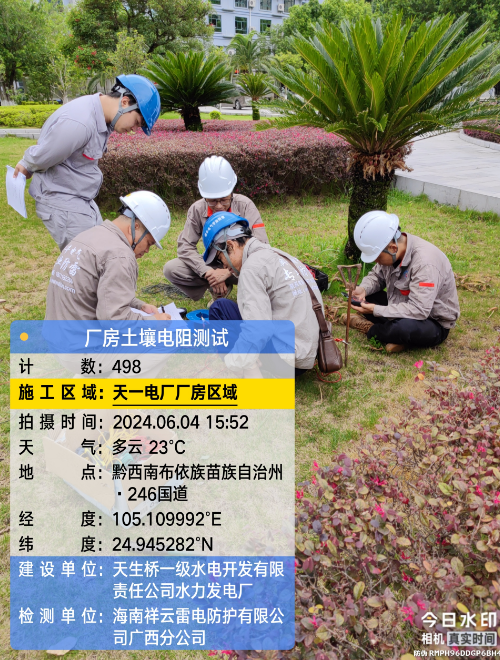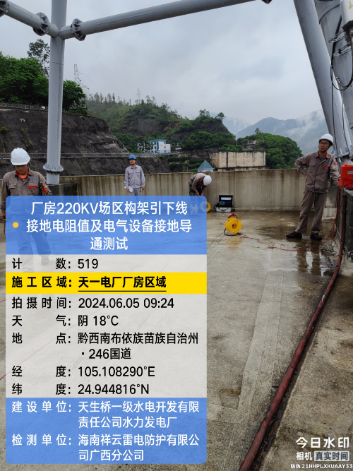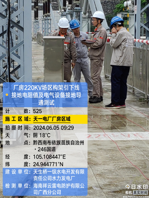 由我公司(海南祥云雷电防护有限公公司广西分公司)中标实施的天一电厂厂房大地网检测项目,我公司技术人员经业主单位2024年6月4日上午三级安全生产考试合格后,6月4日下午开始在厂房区域进行土壤电阻率测试;6月5日对厂房220KV场区构架引下线接地电阻值、电气设备接地以及发电机单机接地导通进行测试;6月6日35KV电天线停电后,对厂房主接地网以及1#-4#变压器的接地电阻值、跨步电压和接触电压等进行测试,完成本项目全部检测工作。详见下图: