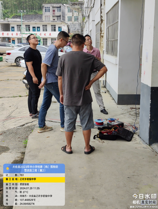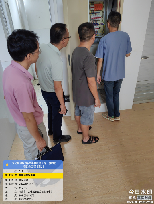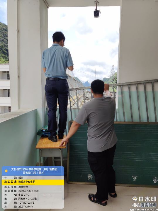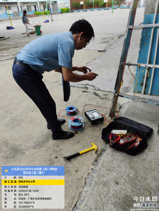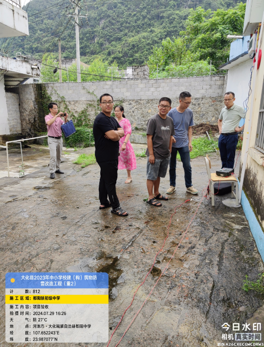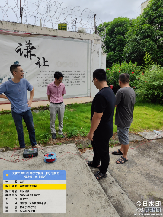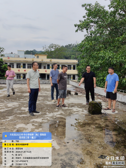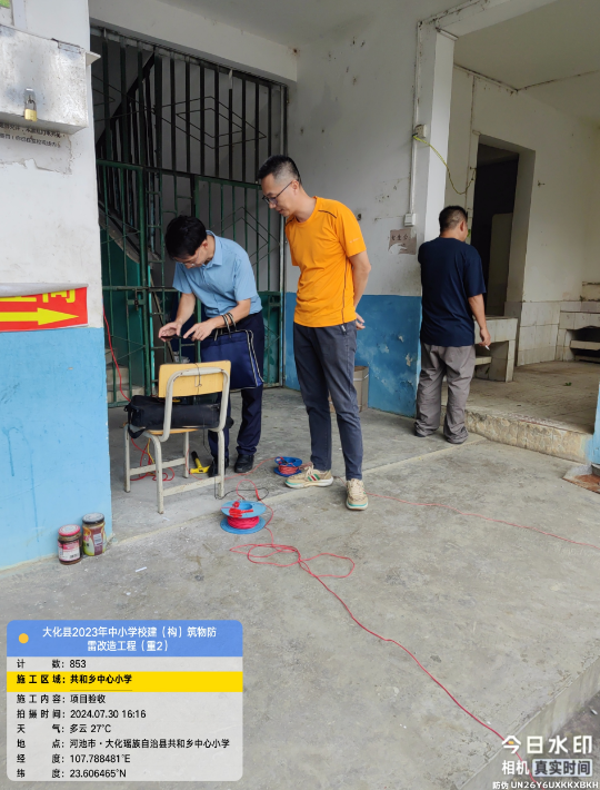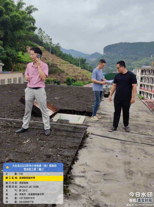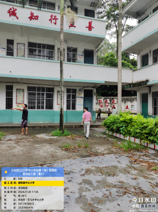 由我公司中标实施的大化瑶族自治县2023中小学校建(构)筑物防雷改造工程(重2),自我方施工人员2024年3月26日进场开始施工,至2024年6月20日历时40个日历天(法定节假日及雨天影响除外)完成九个乡镇14所中小学校的全部施工任务,并通过由建设单位组织会同监理单位、施工单位等相关部门组成联合验收小组于2024年7月29-30日对工程项目进行的竣工验收。详见验收现场图片: