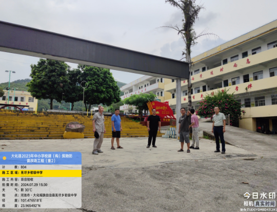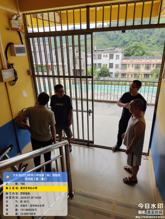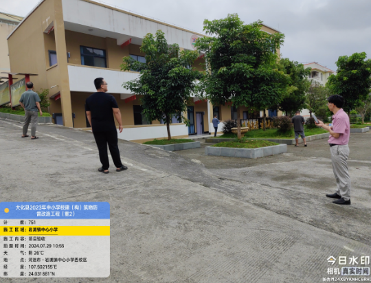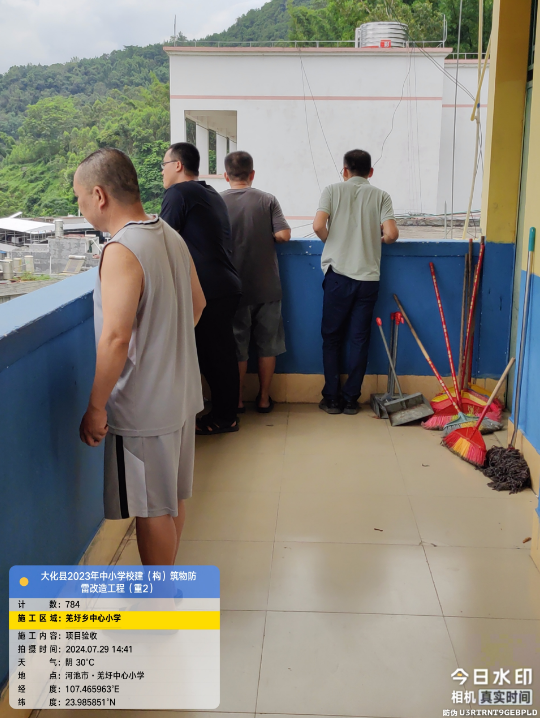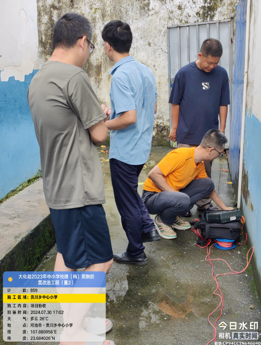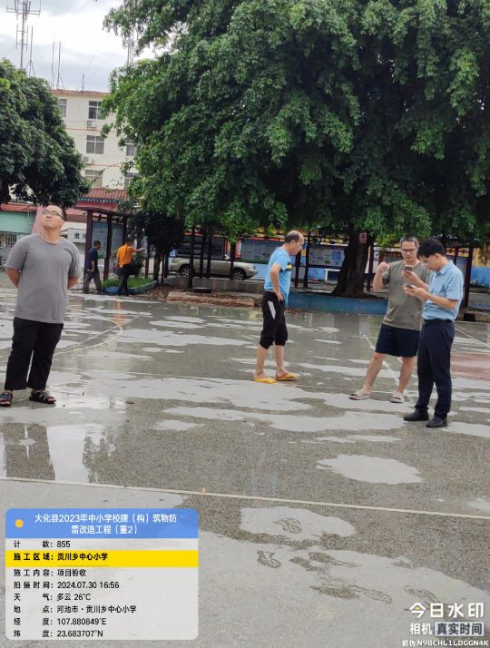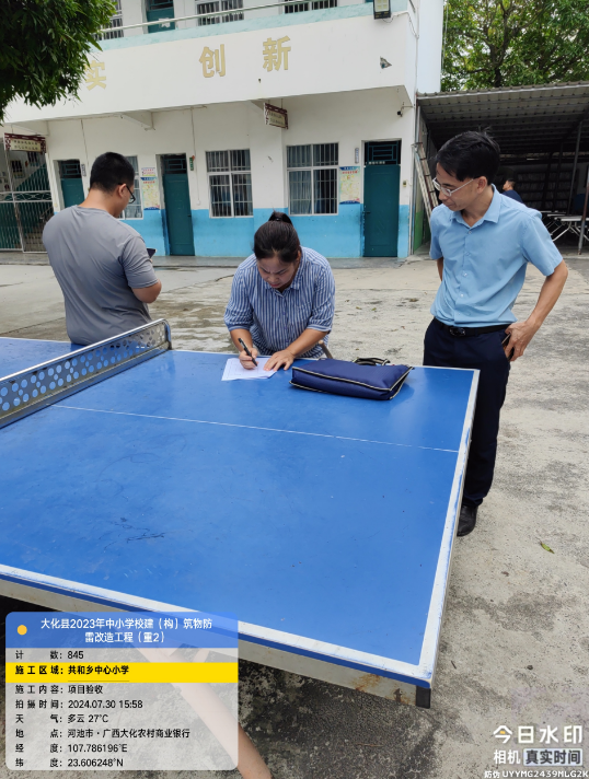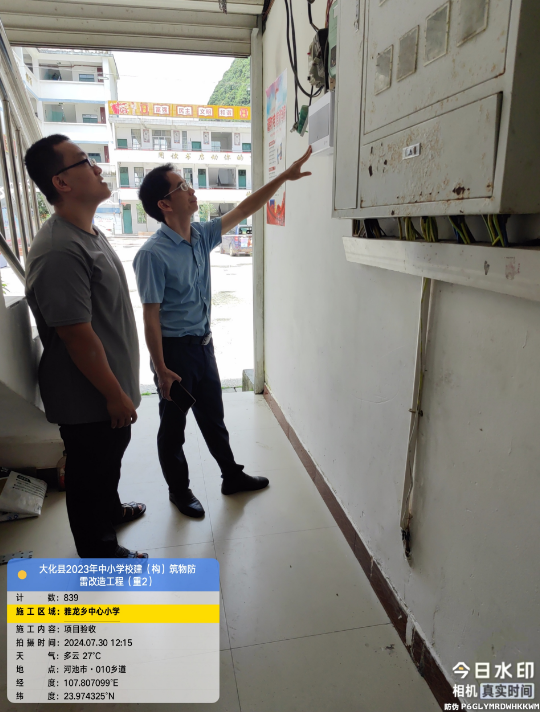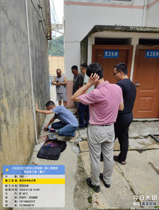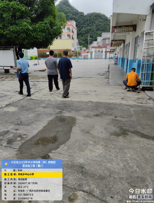 由我公司中标实施的大化瑶族自治县2023中小学校建(构)筑物防雷改造工程(重2),自我方施工人员2024年3月26日进场开始施工,至2024年6月20日历时40个日历天(法定节假日及雨天影响除外)完成九个乡镇14所中小学校的全部施工任务,并通过由建设单位组织会同监理单位、施工单位等相关部门组成联合验收小组于2024年7月29-30日对工程项目进行的竣工验收。详见验收现场图片: