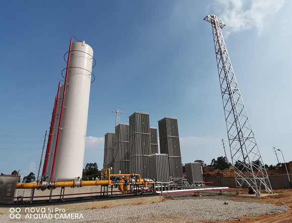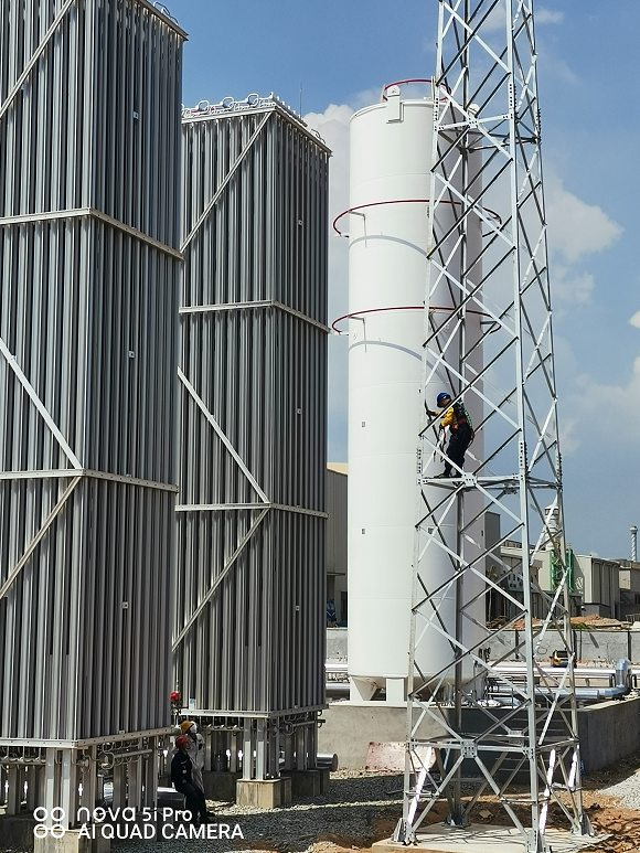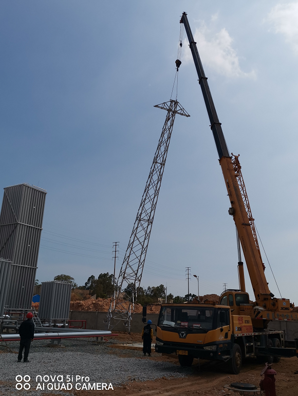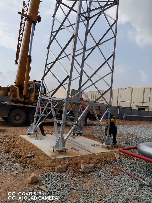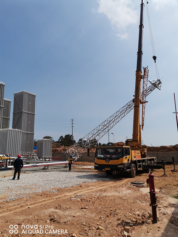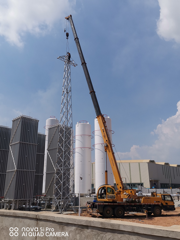 由我公司负责实施的广西北部湾新材料有限公司(北海诚德镍业有限公司)LNG气化站改扩建项目防雷接地工程,2020年7月29日下午成功吊装两座独立避雷塔。详见下图: