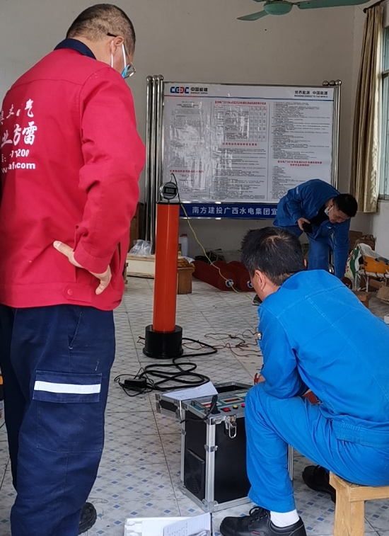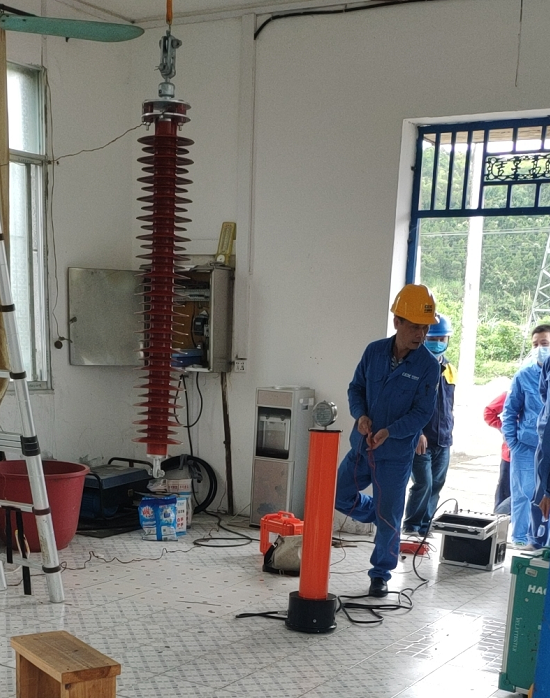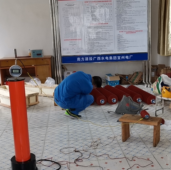 由我公司中标实施的广西水利电力建设集团有限公司宜州水力发电厂拉浪电站避雷针接地网设计改造项目,2020年4月26日由业主单位对我方提交的高压避雷器进行交接试验后,我方开始上塔对高压避雷器进行现场安装。详见下图: